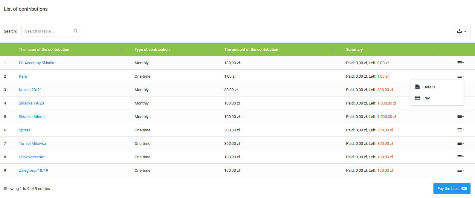 The user has two options to pay the contribution through the system: fast and manual/mass. The quick one consists in choosing the "pay" option from the menu for a given contribution, which will take the user directly to make the payment window. The second option is to pay several contributions simultaneously. To select this option, click the blue button "pay multiple contributions". After clicking, choose which contributions you want to pay. In the next step, enter the amounts for each contribution, month, etc. Then go to payment, select the appropriate way and make a transfer. Payment is also possible from the mobile application.