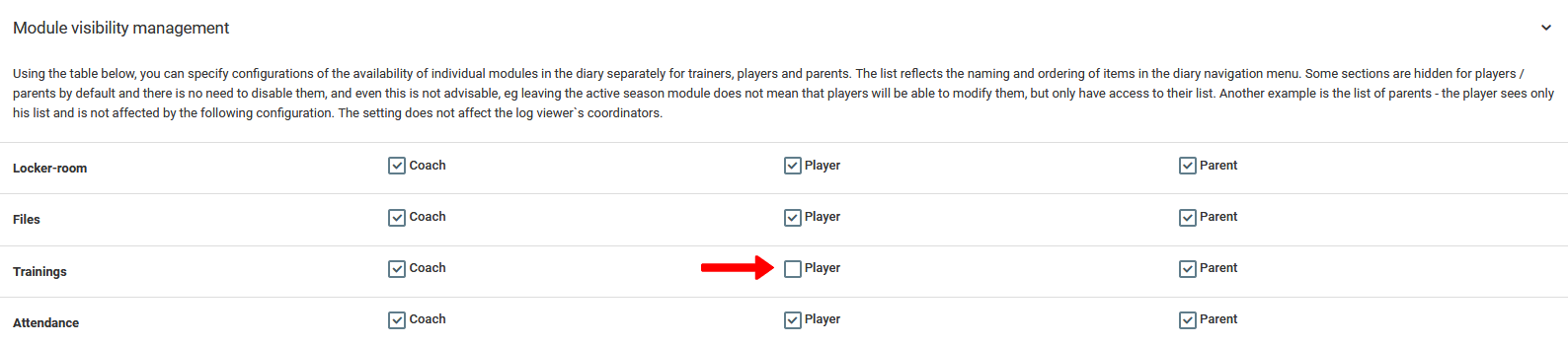 Another element of settings that affects a significant part of the system is the module for hiding diary elements for individual user groups. To hide or show the module for a selected user group, go to the left menu to club settings hidings modules. As you can see in the picture below, managing the visibility of the modules is based on selecting or deselecting chosen elements and the functionality of the diary. By deselecting a given element it will disappear from the menu on the accounts of the selected user group. In the case shown in the picture, access to the training tab has been blocked for players. Remember that these settings apply to all users from a given group in the entity you manage.
