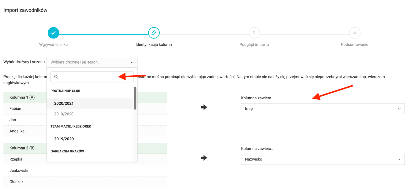 Next, choose the team and season of new users. Then specify the content from the left column to corresponding data on the right. After that, in the next step, you will create usernames and passwords for newly created user groups (player and parent). After pressing "save" the chosen users will be added to the player and parent lists of the selected team.