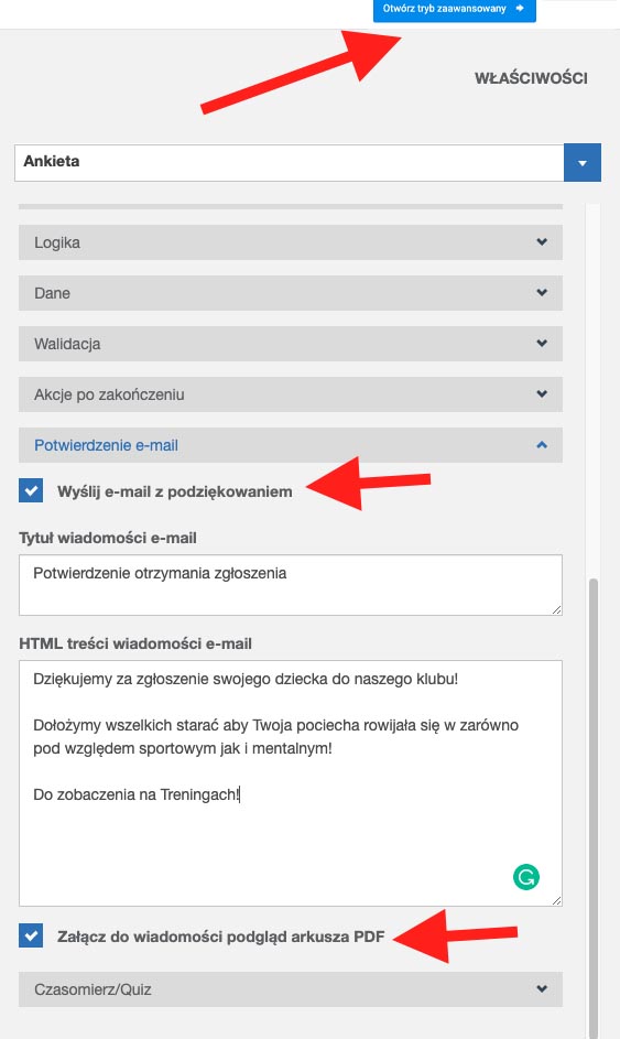 This function lets you send emails to respondents automatically to the mail specified in the form or survey. The content of the message is fully customisable in the form editor.