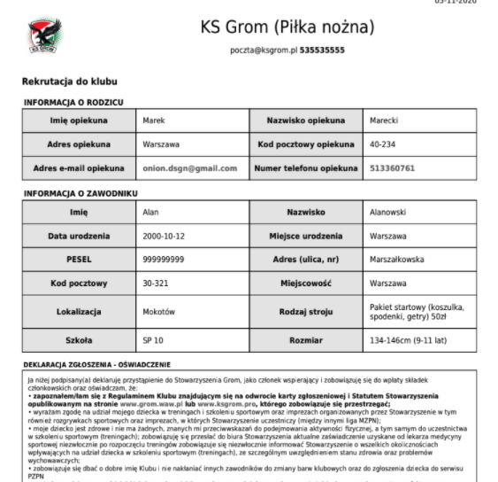 If the club collects this sort of data on paper, the file can be printed so a parent can fill in and return it to the club.