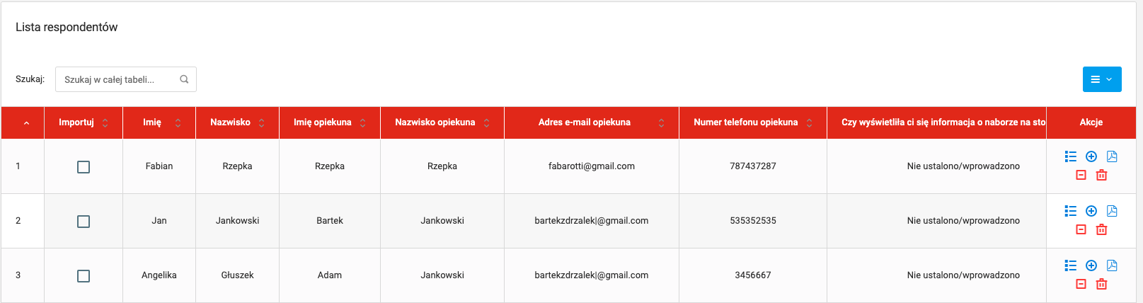 The last column contains a menu with options to: delete or refuse an answer and to preview the respondent’s data on a sub-page or in PDF format. On the right above the table, there is a button to change the view of the table (eye symbol) and a button that allows you to export the whole table to xls, cvs or pdf files.